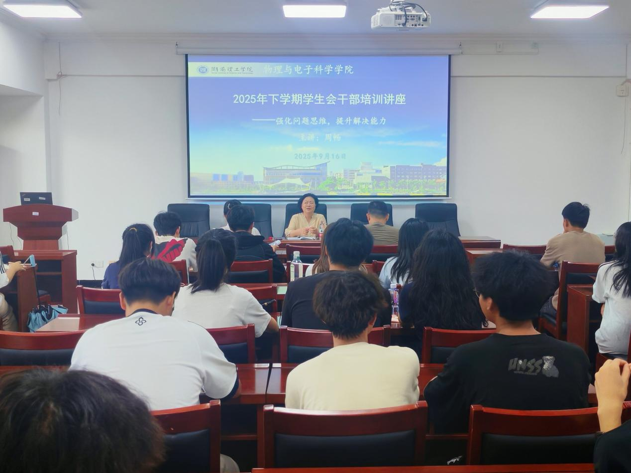 周畅以“强化问题思维,提升解决能力”为题,从“学生会是什么”为切入点展开培训,强调学生会的性质,要求团学干部厘清自身职责定位,她就学生干部会遇到哪些问题,如人与人的问题还是人与事或事与事的问题,是修复型问题还是防范性问题或追求理想型问题,对“如何解决问题”给出了“界定-拆解-执行-复盘”四步法,强调大家要着重培养主人翁思维、闭环思维和创新思维。周畅还通过多个案例说明解决问题需建立辩证的思维,逐步提升透过问题看本质的能力。