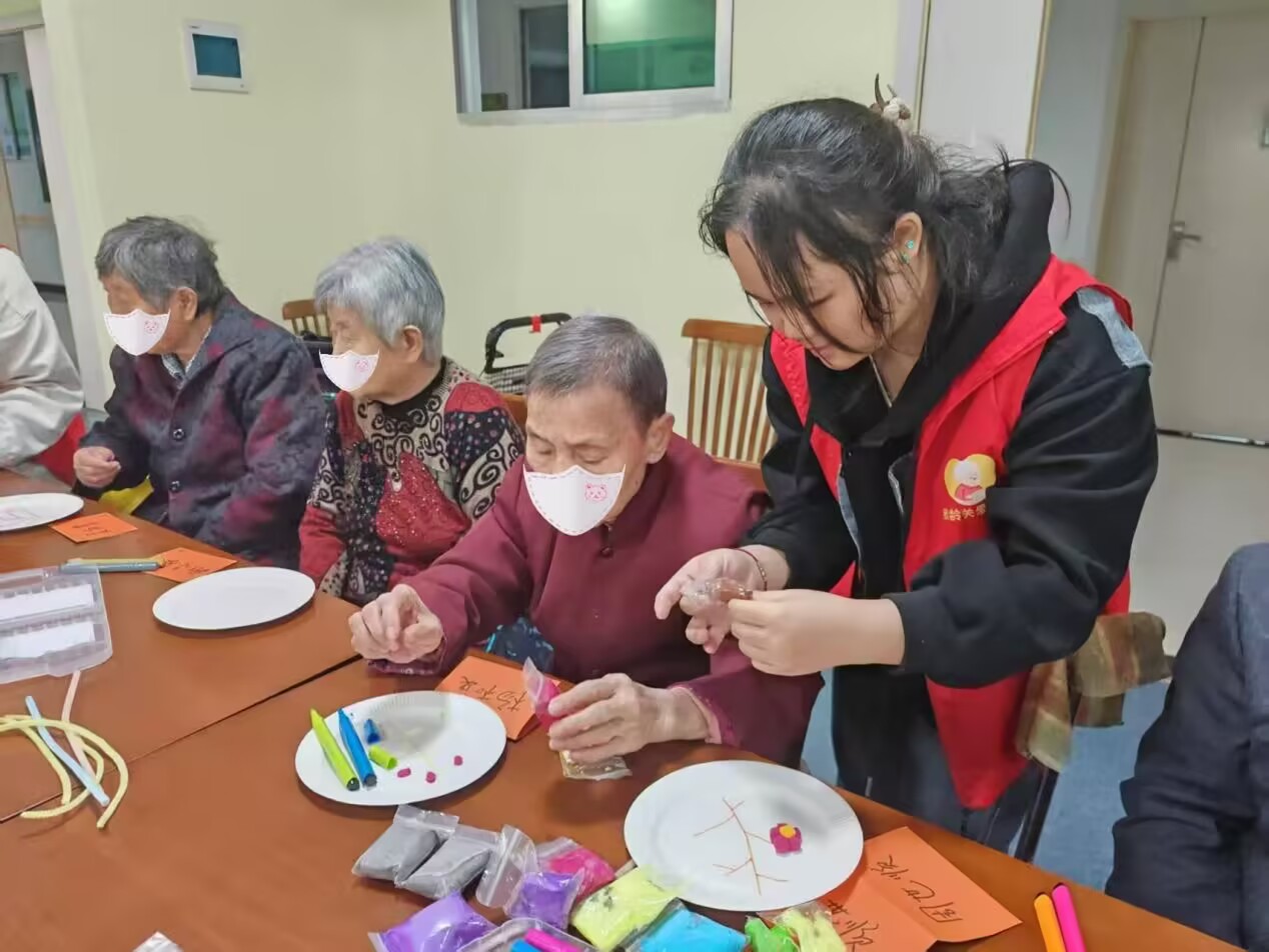 活动中,志愿者组织“报纸拉球”趣味游戏,提前布置材料引导老人分组协作,在欢笑与喝彩中帮老人重拾童趣;手工区里,志愿者分发轻黏土、彩笔,耐心讲解技巧,协助老人完成雅致的梅花画作品,让老人们收获满满成就感;“银发欢歌”环节,志愿者邀请鼓励老人登台唱响《东方红》等经典老歌,全场跟唱将温情氛围推向顶点。