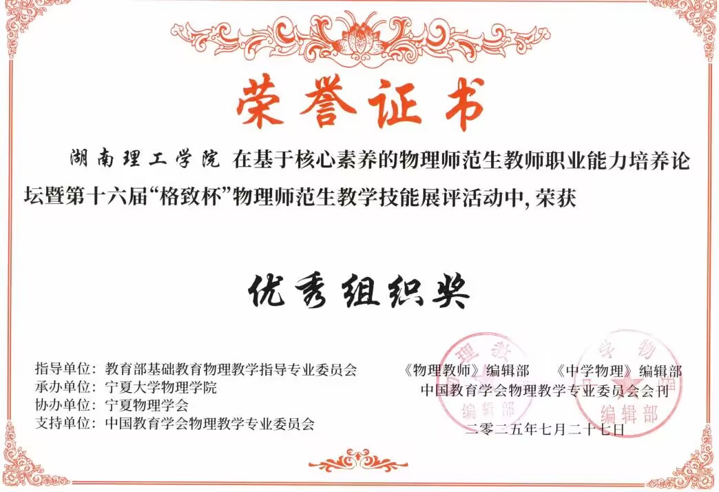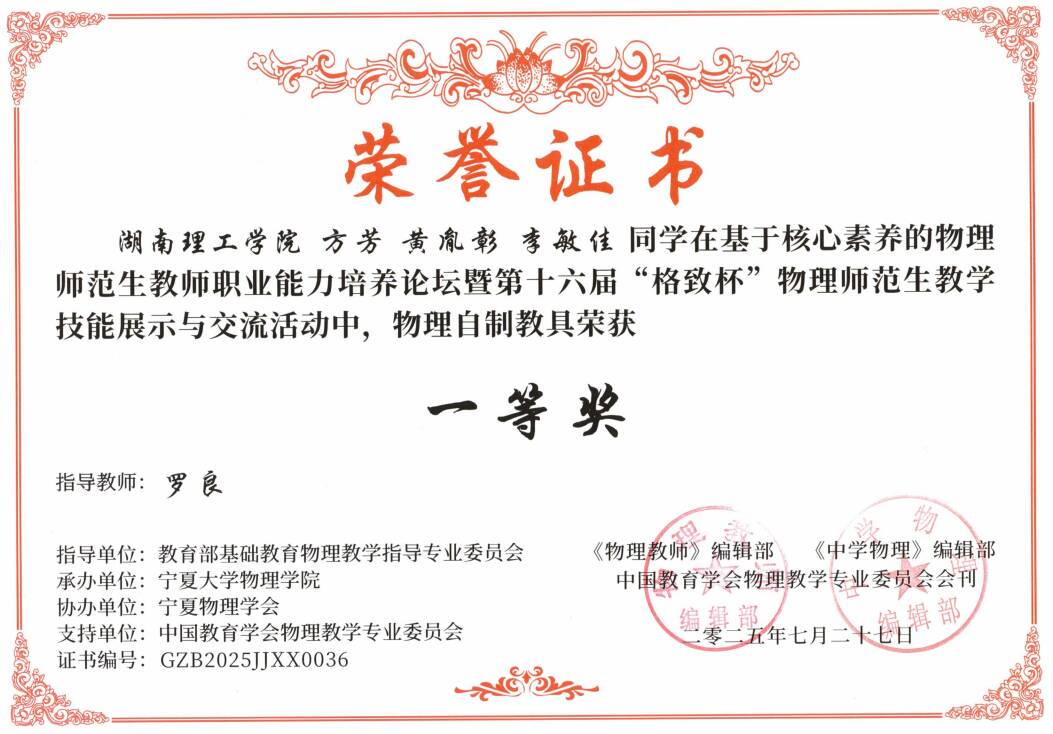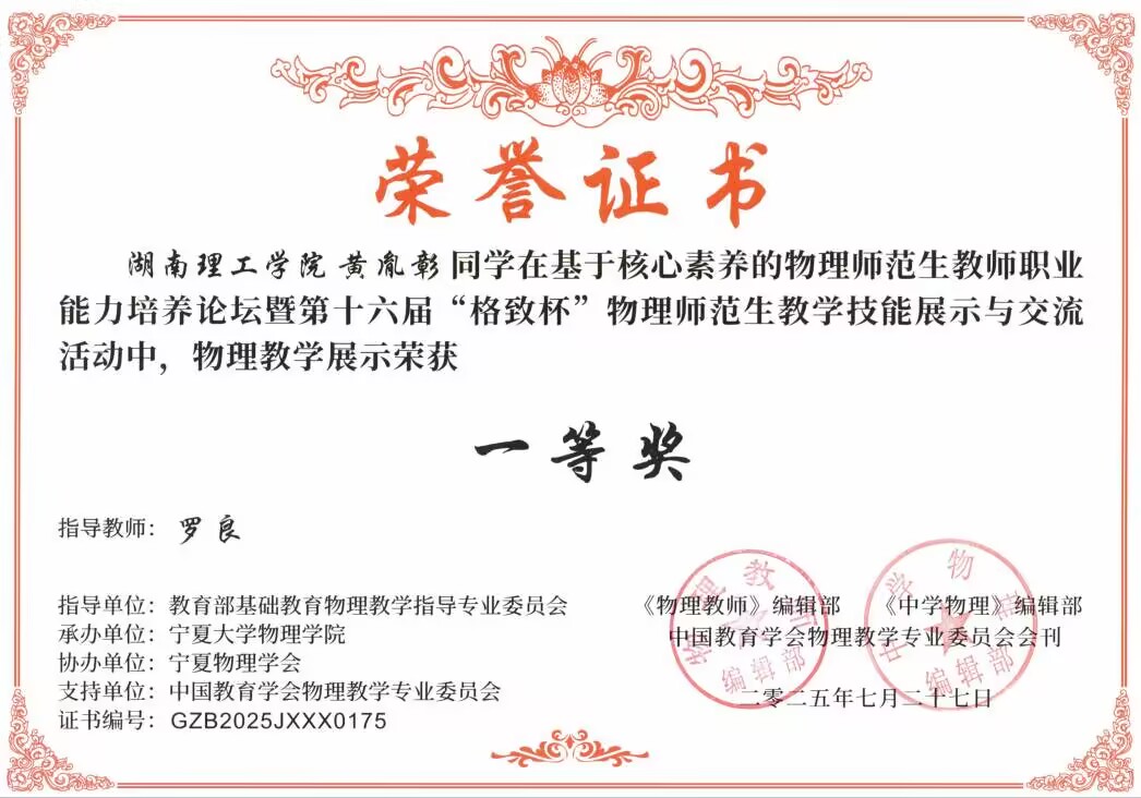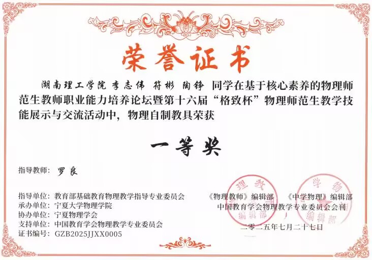2025年7月,在第十六届“格致杯”物理师范生教学技能展评活动中,威廉希尔官方网站学子表现优异,威廉希尔官方网站荣获优秀组织奖,物理23-1BS班的黄胤彰同学荣获“物理教学展示”一等奖;物理22-1BS班的李志伟、符彬、陶铮同学和物理23-2BS班的方芳、黄胤彰、李敏佳同学,荣获“物理自制教具”一等奖;学科教学(物理)2024级研究生胡天路、彭颖、汤朗煊同学荣获“物理教学论文展示”一等奖;此外,物理22-2BS班的舒铄茹、李享同学,物理23-1BS班的李诗扬同学,物理23-2BS班的王秋怡同学,学科教学(物理)2024级研究生彭颖、胡天路等同学荣获“物理教学展示”二等奖,物理23-2BS班的廖艳虹同学荣获“物理教学展示”三等奖;物理22-2BS班的孙静怡、董心慈、李享同学,物理23-2的张雅卉同学荣获“物理自制教具”二等奖,李诗扬、彭颖、胡天路的物理教具荣获三等奖;黄胤彰、董心慈、侯心怡、曾家豪、彭颖、胡天路等人的物理教学论文荣获二等奖。