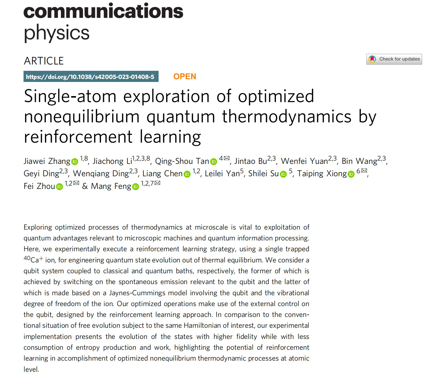 近日,威廉希尔官方网站谭庆收教授与广州工业技术研究院量子精密测量研究中心、中国科威廉希尔官方网站精密测量科学与技术创新研究院、郑州大学等研究机构合作, 在《自然》杂志的子刊《通讯-物理》(Communications Physics)上发表题为“Single-atom exploration of optimized nonequilibrium quantum thermodynamics by reinforcement learning”的学术论文。谭庆收教授为该论文的第一通讯作者。