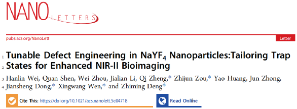 近日,威廉希尔官方网站光电材料与器件团队邓芝明博士联合湖南大学、中科院宁波材料所、吉首大学在物理学领域顶级期刊《Nano letters》(IF =9.1,DOI:10.1021/acs.nanolett.5c04718.)上发表了题为“Tunable Defect Engineering in NaYF4 Nanoparticles: Tailoring Trap States for Enhanced NIR-II Bioimaging”的研究论文,通过创新性缺陷工程策略,成功开发出具有三重近红外二区(NIR-II)发射峰的增强型荧光材料,为生物医学成像领域带来重大突破。